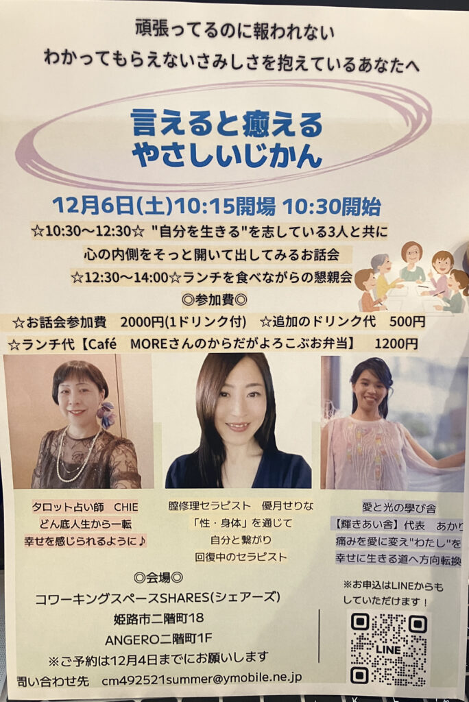 心豊かに笑顔で未来を迎えるために、「今の自分」を見つめるひとときを過ごしてみませんか? 📅 開催概要日時: 2025年11月1日(土) 11:00〜12:30会場: コワーキングスペースSHARES 3階セミナールーム(姫路市二階町18)参加費: 3,300円(ランチ付き)... -